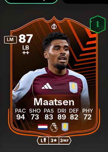 Introducing Ian Maatsen's UEL Primetime card, a formidable 87-rated Left Back who brings blistering pace and technical skill to the defensive flank. With standout attributes including a phenomenal 94 Pace, 89 Dribbling, and 83 Passing, this card excels in its position by offering explosive overlapping runs and reliable ball progression. As a modern full-back, Maatsen's exceptional speed and control make him a sharp attacking outlet, capable of swiftly tearing apart the opposing team's defense on the wing, creating decisive chances, and helping to seal the deal in crucial moments.